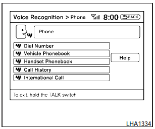 2. The system announces, Would you like to access Phone, Navigation, Information, Audio or Help? 3. Say Phone.